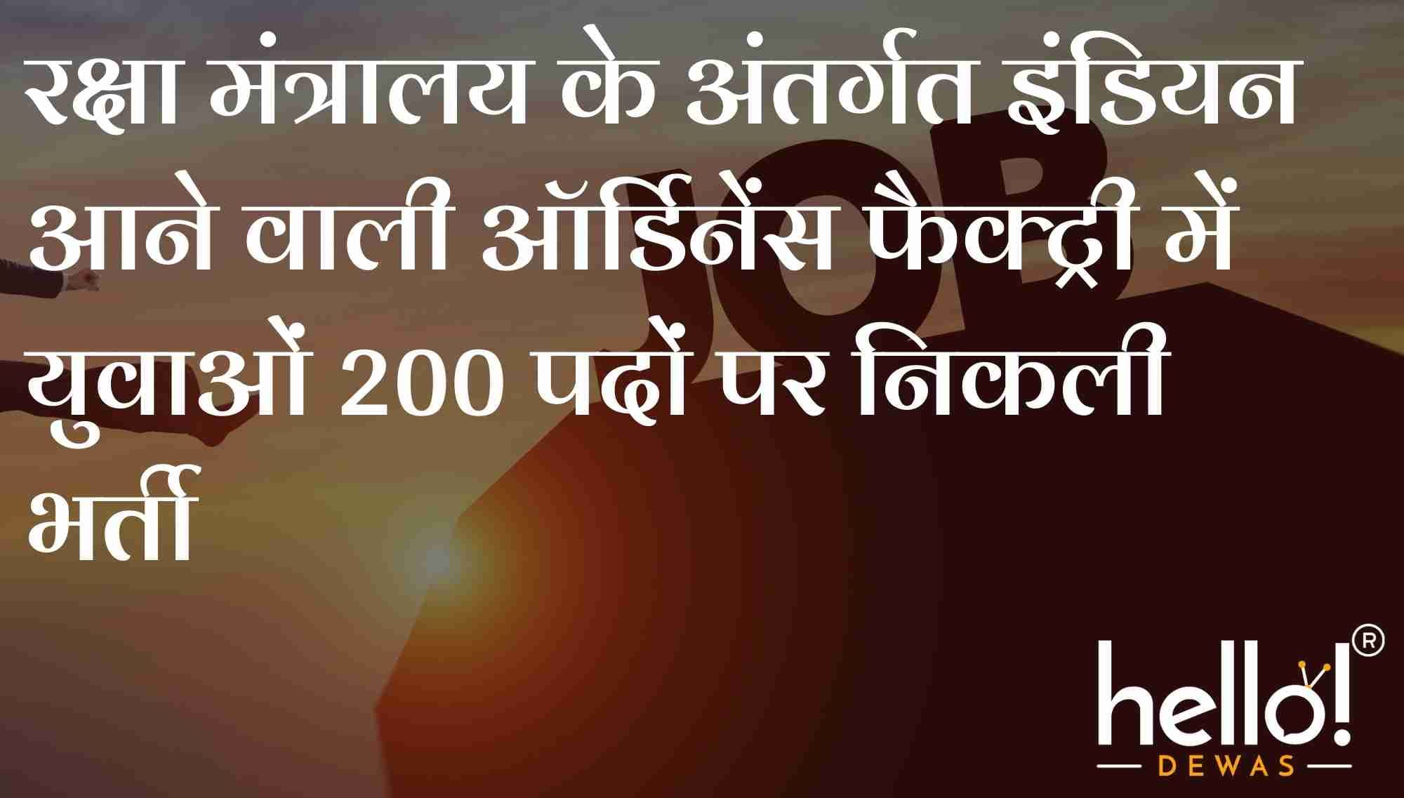 रक्षा मंत्रालय के अंतर्गत इंडियन आने वाली ऑर्डिनेंस फैक्ट्री में युवाओं 200 पदों पर निकली भर्तीरक्षा मंत्रालय के अंतर्गत आने वाली इंडियन ऑर्डिनेंस फैक्ट्री, खमरिया ने डैंजर बिल्डिंग वर्कर्स के पदों पर भर्ती निकाली है। नोटिफिकेशन जारी करके एओसीपी ट्रेड प्रोसेसिंग ऑर्डिनेंस फैक्ट्रीज ट्रेनिंग/मिलिट्री एम्युनिशन मैन्युफैक्चरिंग और हैंडलिंग में एक्सपीरियंस वाले युवाओं से आवेदन मांगे गए हैं।