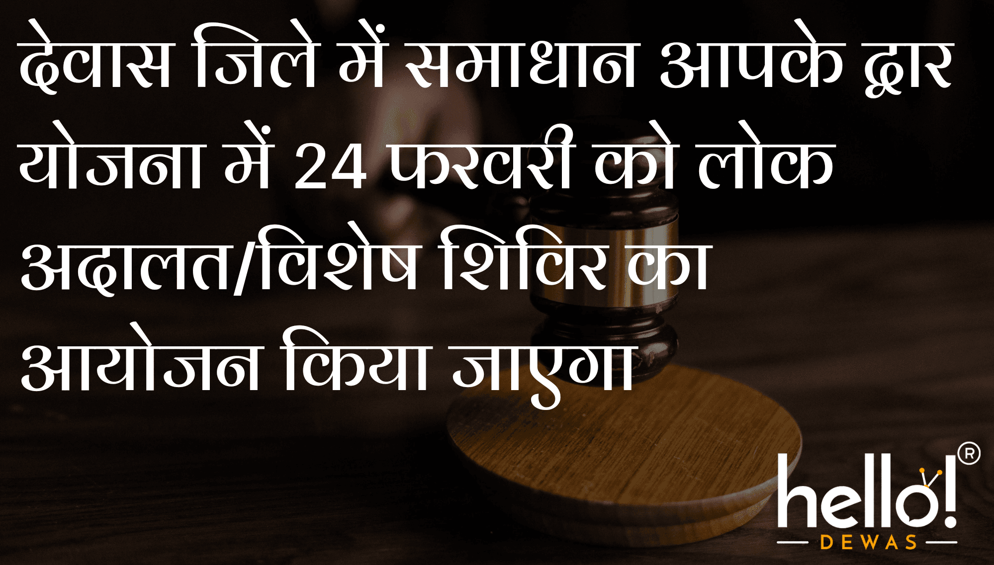 देवास जिले में समाधान आपके द्वार योजना में 24 फरवरी को लोक अदालत/विशेष शिविर का आयोजन किया जाएगा उच्च न्यायालय विधिक सेवा समिति इंदौर एवं म.प्र. राज्य विधिक सेवा प्राधिकरण जबलपुर के निर्देशानुसार एवं प्रधान जिला न्यायाधीश/अध्यक्ष जिला विधिक सेवा प्राधिकरण देवास श्री मधुसूदन मिश्र के मार्गदर्शन में आम नागरिकों के राजीनामा योग्य प्रकरणों का अधिक से अधिक संख्या में निराकरण करने के लिए जिले में ‘‘समाधान आपके द्वार‘‘ योजनांतर्गत 24 फरवरी को लोक अदालत/विशेष शिविर का आयोजन किया जायेगा।