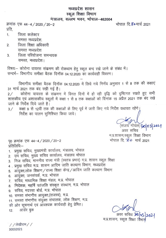 मध्यप्रदेश में पहली से लेकर 8वीं तक के सभी सरकारी और निजी स्कूल 15 अप्रैल तक बंद ही रहेंगे। 9वीं से लेकर 12वीं तक की क्लासेस पूर्व में जारी आदेश के अनुसार 1 अप्रैल से संचालित की जा सकेंगी। इसमें पेरेंट्स की सहमति जरूरी होगी। प्रदेश में अभी 31 मार्च तक सभी तरह के शिक्षण संस्थान बंद किए गए थे।