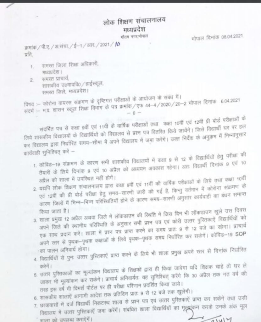 उल्लेखनीय है कि प्रदेश के समस्त शासकीय विद्यालयों से कक्षा 9वीं और 11वीं की वार्षिक परीक्षाओं एवं कक्षा 10वीं और 12वीं की प्री बोर्ड परीक्षाओं के लिए विद्यार्थियों को प्रश्न पत्र वितरित किए जाएँगे। विद्यार्थी घर पर प्रश्नों को हल कर विद्यालय द्वारा निर्धारित समय-सीमा में अपने विद्यालय में जमा कर सकेंगे।