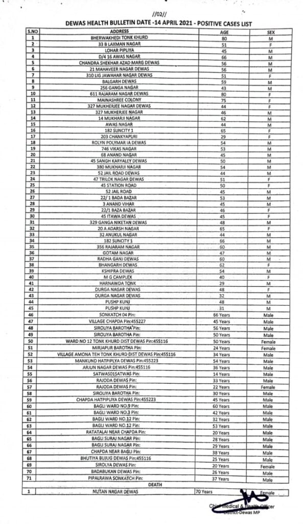 देवास कोरोना हेल्थ बुलेटिन – 14 अप्रैल 2021 (यूनिट.आई.डी.एस.पी.)