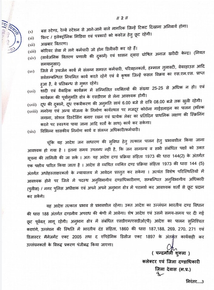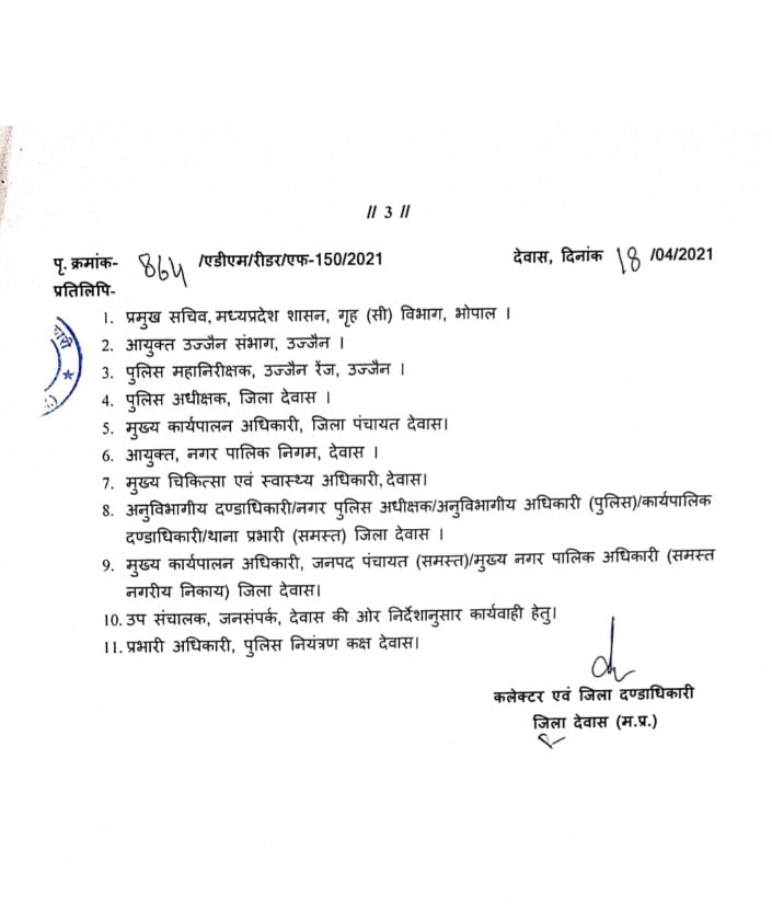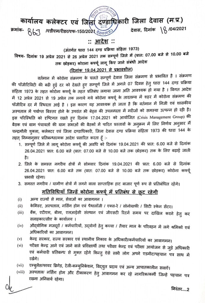 April 18, 2021 - In City News‚ Goverment By hellodewas@gmail.com 0 देवास में कल से लगने वाले कोरोना कर्फ्यू को लेकर जारी किए आदेश , जानिए किन गतिविधियों में रहेगी छुंट👇👇 Previous देवास कोरोना हेल्थ बुलेटिन Next देवास कलेक्टर श्री चंद्रमौली शुक्ला की अध्यक्षता में प्रायवेट नर्सिंग होम संचालकों की बैठक सम्पन्न