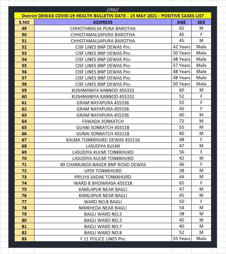 देवास कोरोना हेल्थ बुलेटिन – 15 मई 2021 (यूनिट.आई.डी.एस.पी.)