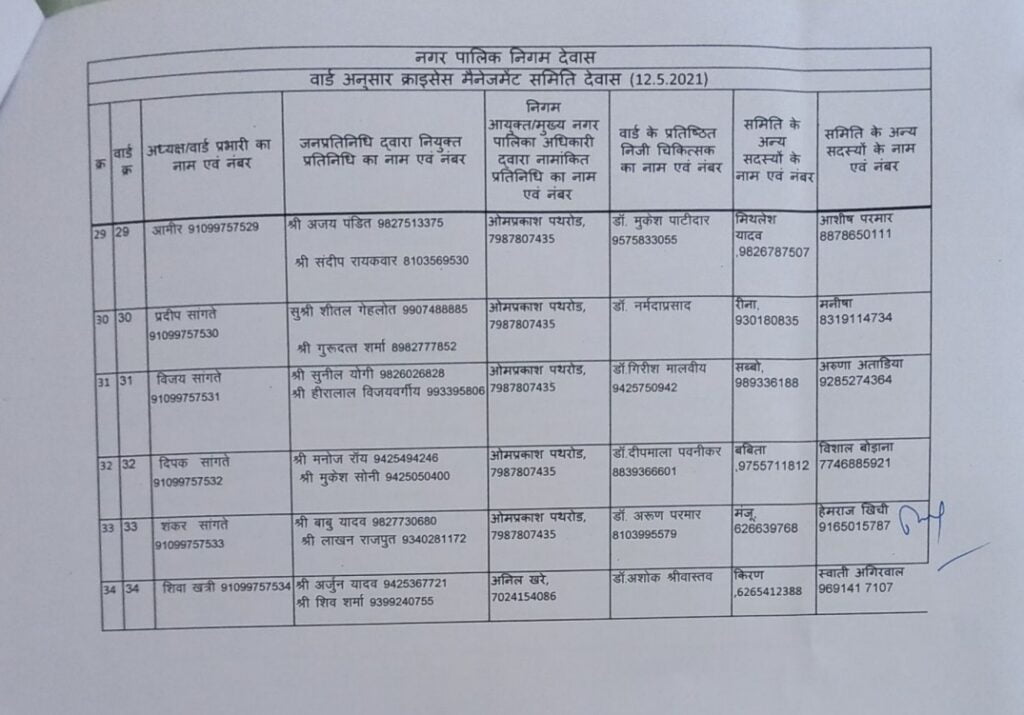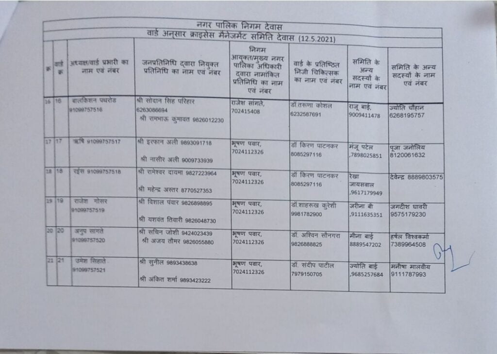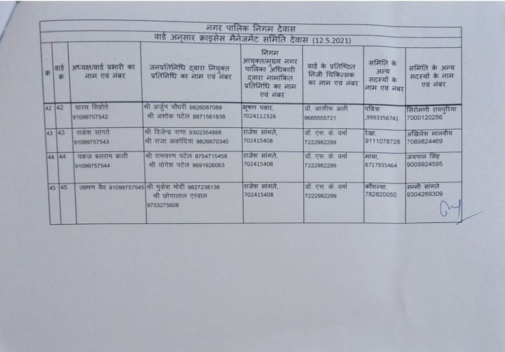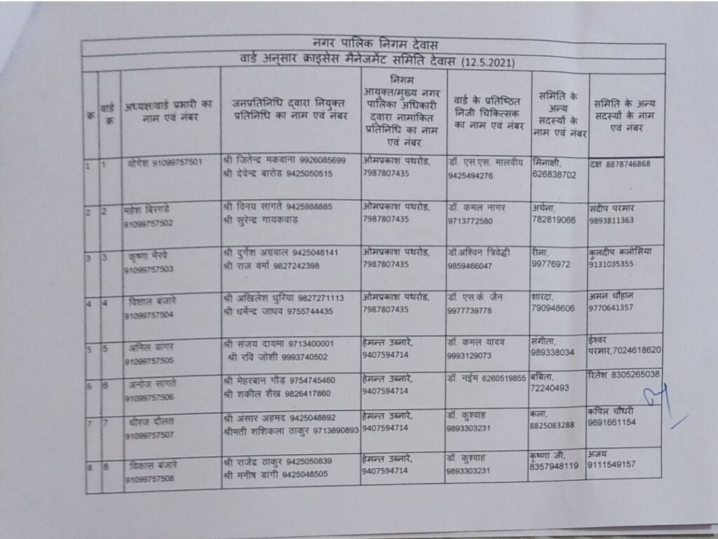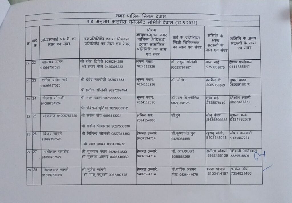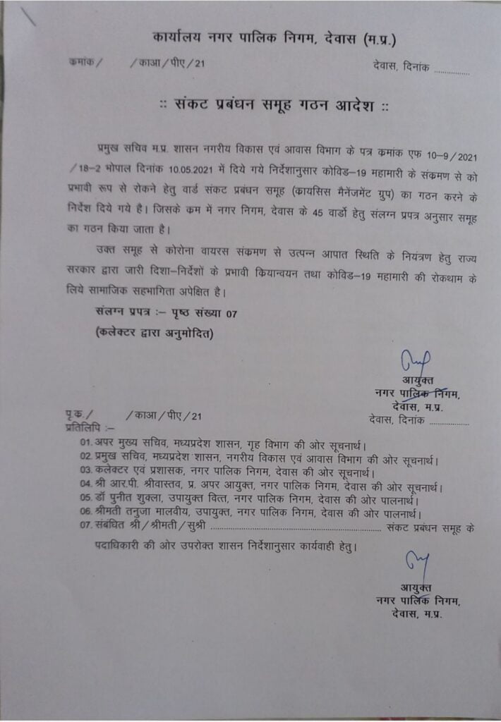 देवास शहर के 45 वार्डों में क्राइसिस मैनेजमेंट ग्रुप की स्थापना कर इन ग्रुप में वार्ड के दो जनप्रतिनिधि द्वारा चयनित सदस्य , एक नगर निगम , एक वार्ड के चिकित्सक , दो अन्य सदस्य और नगर निगम द्वारा नियुक्त वार्ड प्रभारी होंगे । राज्य सरकार द्वारा 24 नई कैटेगरी के लोगों को फ्री अनाज वितरण किया जाएगा । इसके लिए वार्ड के यह दोनों प्रतिनिधि लोगों की मदद करेंगे ।