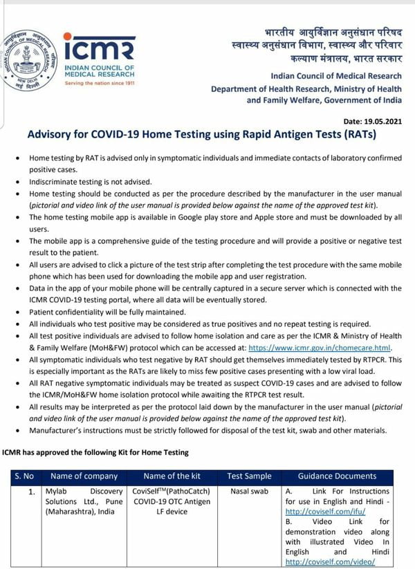 होम आइसोलेशन टेस्टिंग किट के लिए पुणे की कंपनी माई लैब डिस्कवरी सॉल्यूशन लिमिटेड को अधिकृत किया गया है। टेस्टिंग किट का नाम COVISELF (Pathocatch) है।