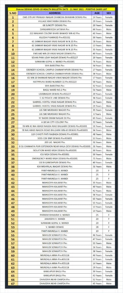 देवास कोरोना हेल्थ बुलेटिन – 21 मई 2021 (यूनिट.आई.डी.एस.पी.)