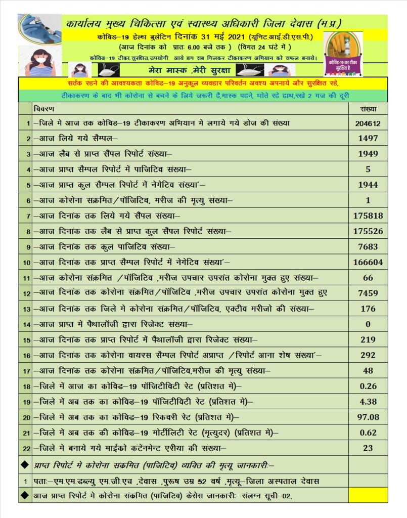 देवास कोरोना हेल्थ बुलेटिन – 31 मई 2021 (यूनिट.आई.डी.एस.पी.)