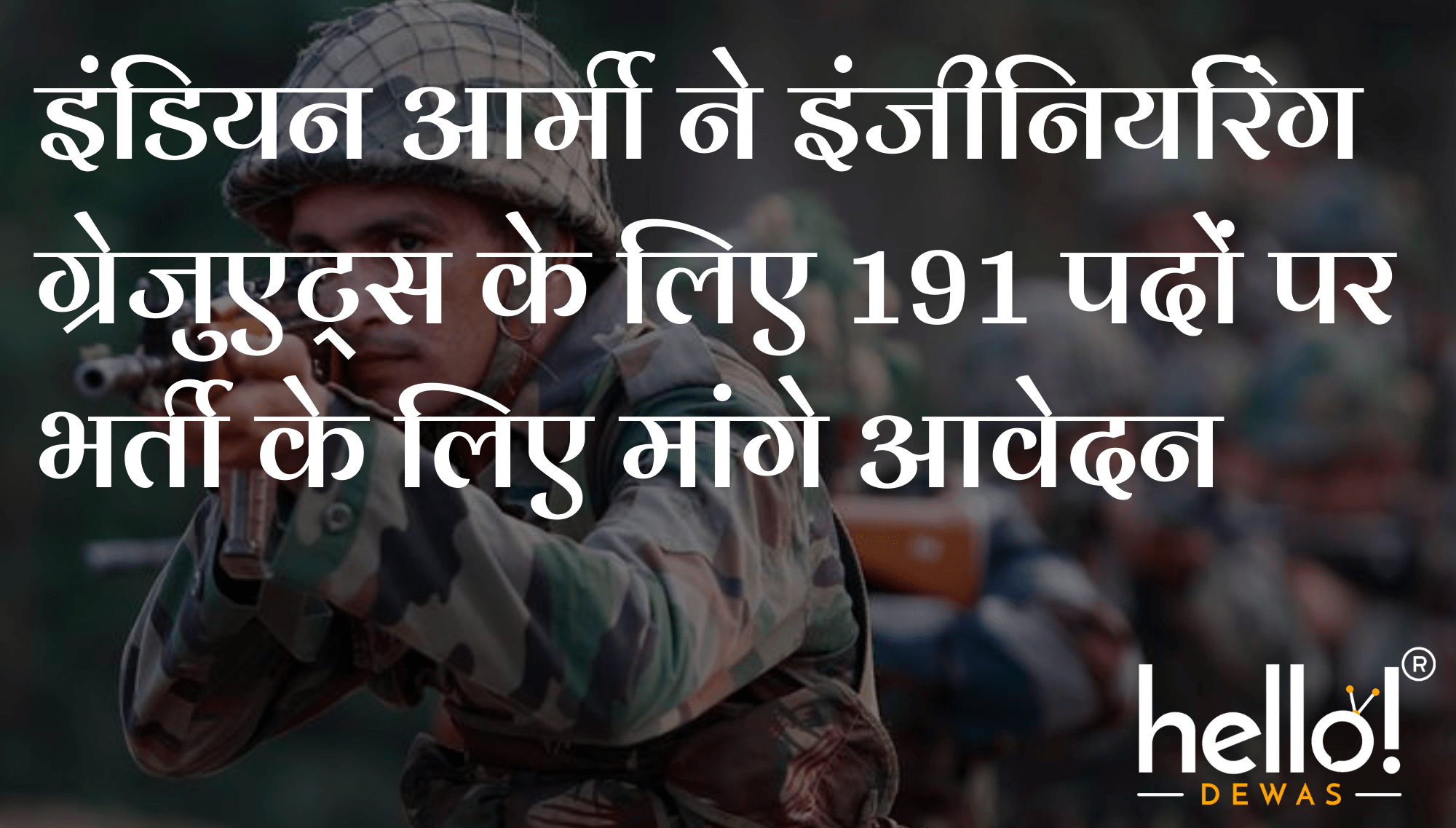 इंडियन आर्मी ने शॉर्ट सर्विस कमीशन (SSC) की भर्ती के लिए नोटिफिकेशन जारी कर आवेदन मांगे हैं। इन पदों के लिए अविवाहित पुरुष और महिला इंजीनियरिंग ग्रेजुएट्स एवं रक्षा कर्मियों की विधवाएं 25 मई से 23 जून 2021 तक joinindianarmy.nic.in के जरिए आवेदन कर सकते हैं।पदों के लिए सिलेक्ट हुए कैंडिडेट्स की SSC कोर्स अक्टूबर 2021 में ऑफिसर्स ट्रेनिंग एकेडमी (OTA), चेन्नई, तमिलनाडु में शुरू होगी। इस भर्ती प्रक्रिया के जरिए कुल 191 रिक्तियों पर भर्ती की जाएगी।