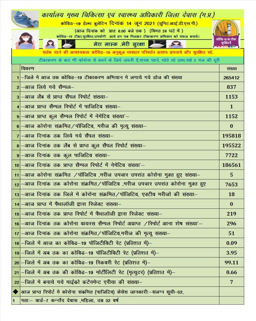 देवास कोरोना हेल्थ बुलेटिन – 14 जून 2021 (यूनिट.आई.डी.एस.पी.)