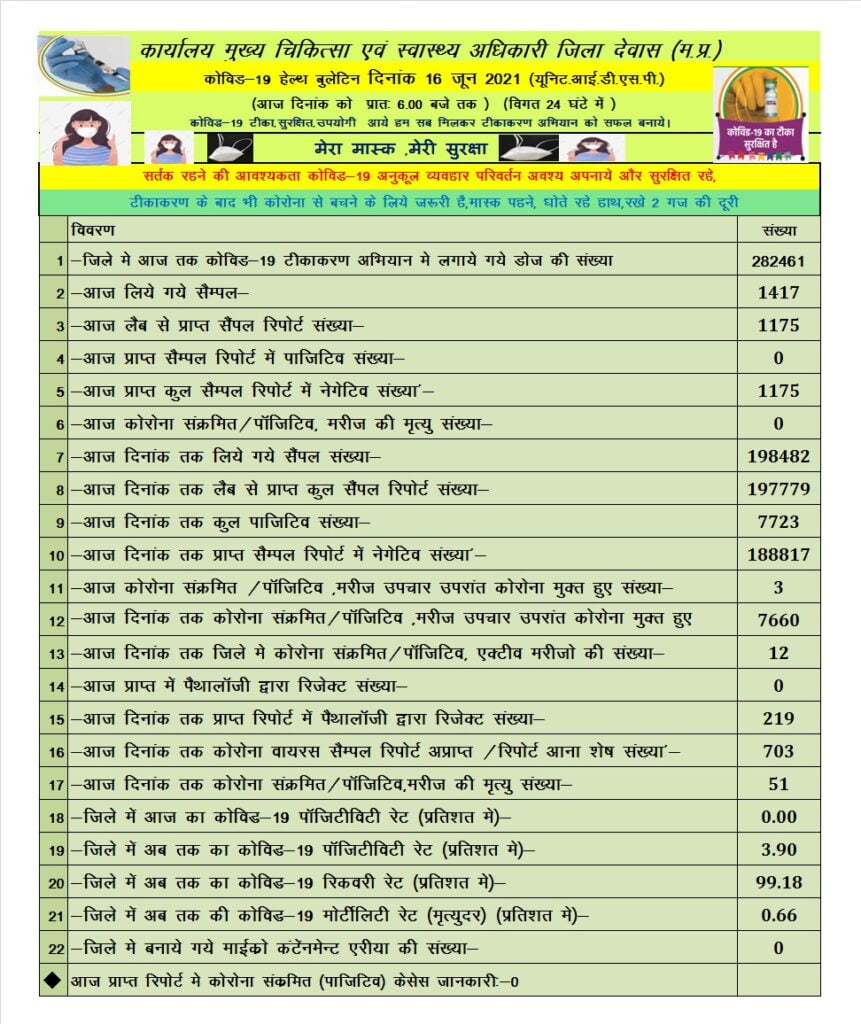 देवास कोरोना हेल्थ बुलेटिन – 16 जून 2021 (यूनिट.आई.डी.एस.पी.)
