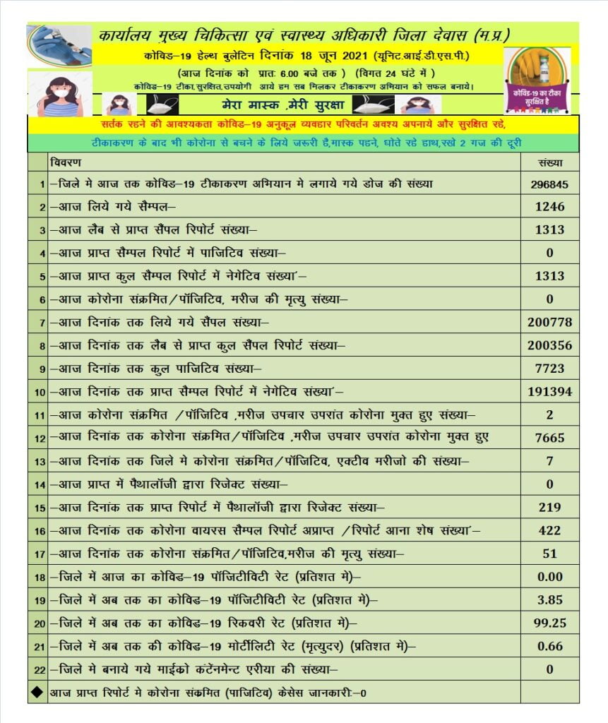 देवास कोरोना हेल्थ बुलेटिन – 18 जून 2021 (यूनिट.आई.डी.एस.पी.)