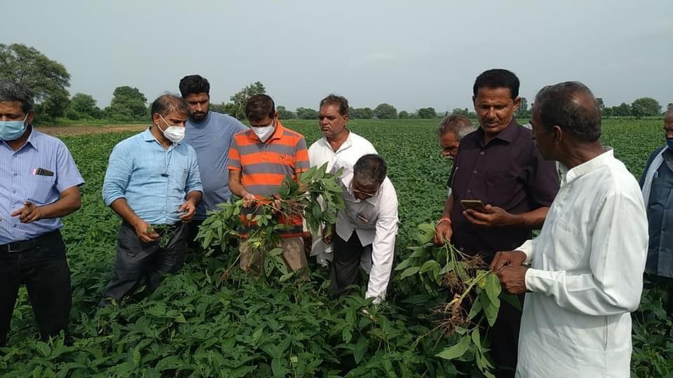 जिले में वर्तमान में सोयाबीन की फसल में तने की मक्खी, सेमीलूपर, तंबाकू की इल्ली, चने की इल्ली एवं रोगों का प्रकोप होने संबंधी जानकारी प्राप्त हो रही है, जिसको ध्यान में रखते हुए कृषि विज्ञान केन्द्र के प्रधान वैज्ञानिक एवं प्रमुख डॉ. ए.के.दीक्षित के दिशा-निर्देश व मार्गदर्शन में केन्द्र के वैज्ञानिकों के साथ कृषि विभाग के अधिकारियों की डायग्नोस्टिक टीम द्वारा विकासखण्ड टोंकखुर्द के चौबाराधीरा, मुंडला दांगी, इकलेरा माताजी, इलासखेड़ी, धूतखेड़ा, किंदूरिया, कल्लूखेड़ी, चौबारा, भूतिया एवं सोनकच्छ विकासखण्ड के नराना, अरनिया, खटम्बा, जामगोद ग्रामों के कृषकों के खेतों में सोयाबीन फसल का निरीक्षण किया।