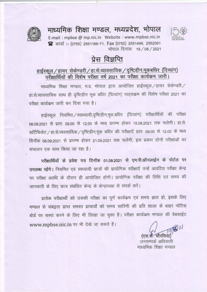 मध्य प्रदेश बोर्ड ऑफ सेकेंड्री एजुकेशन (MPBSE) ने हाईस्कूल, हायर सेकेंड्री और हायर सेकेंडरी वोकेशनल के साथ-साथ नेत्रहीन-बधिर (दिव्यांग) के लिए विशेष परीक्षा 2021 का शेड्यूल जारी कर दिया है।