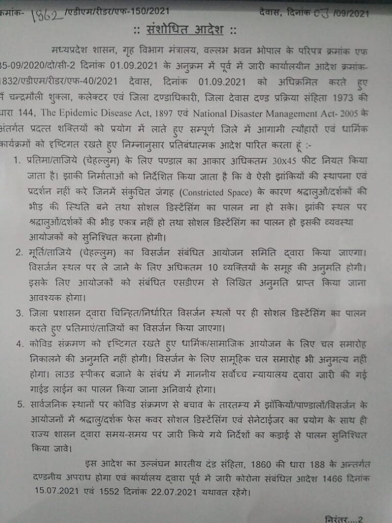 कलेक्टर एवं जिला दण्डाधिकारी श्री चन्द्रमौली शुक्ला ने दण्ड प्रक्रिया संहिता 1973 की धारा 144, The Epidemic Disease Act, 1897 एवं National Disaster Management Act-2005 के अंतर्गत प्रदत्त शक्तियों को प्रयोग में लाते हुए सम्पूर्ण जिले में आगामी त्यौहारों एवं धार्मिक कार्यक्रमों को दृष्टिगत रखते हुए संशोधित प्रतिबंधात्मक आदेश जारी किये है। जारी आदेशानुसार प्रतिमा/ताजिये(चेहल्लुम) के लिए पण्डाल का आकार अधिकतम 30×45 फीट नियत किया है। झाकी निर्माताओं को निर्देशित किया जाता है कि वे ऐसी झांकियों की स्थापना एवं प्रदर्शन नहीं करे जिनमें संकुचित जंगह (Constricted Space) के कारण श्रद्धालुओं/दर्शकों की भीड़ की स्थिति बने तथा सोशल डिस्टेंसिंग का पालन ना हो सके। झांकी स्थल पर श्रद्धालुओं/दर्शकों की भीड़ एकत्र नहीं हो तथा सोशल डिस्टेंसिंग का पालन हो इसकी व्यवस्था आयोजकों को सुनिश्चित करना होगी। मूर्ति ताजिये (चेहल्लुम) का विसर्जन संबंधित आयोजन समिति द्वारा किया जाएगा। विसर्जन स्थल पर ले जाने के लिए अधिकतम 10 व्यक्तियों के समूह की अनुमति होगी। इसके लिए आयोजकों को संबंधित एसडीएम से लिखित अनुमति प्राप्त किया जाना आवश्यक होगा।