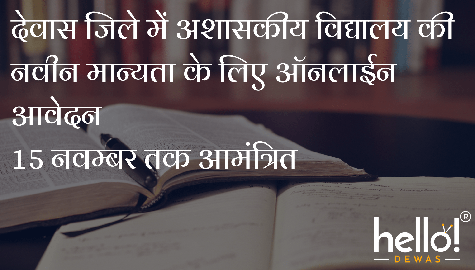 जिला शिक्षा अधिकारी देवास ने बताया कि लोक शिक्षण संचालनालय द्वारा वर्ष 2022-23 में अशासकीय विद्यालय की नवीन मान्यता के लिए एम.पी. आनलाईन पोर्टल के माध्यम से आवेदन 15 नवम्बर 2021 तक आमंत्रित किये गये है।