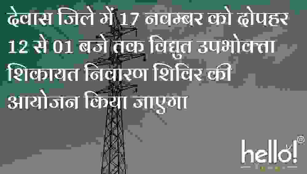 देवास जिले में 17 नवम्बर को दोपहर 12 से 01 बजे तक विद्युत उपभोक्ता शिकायत निवारण शिविर की आयोजन किया जाएगा ।