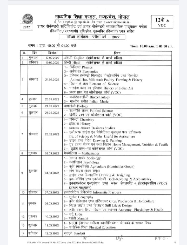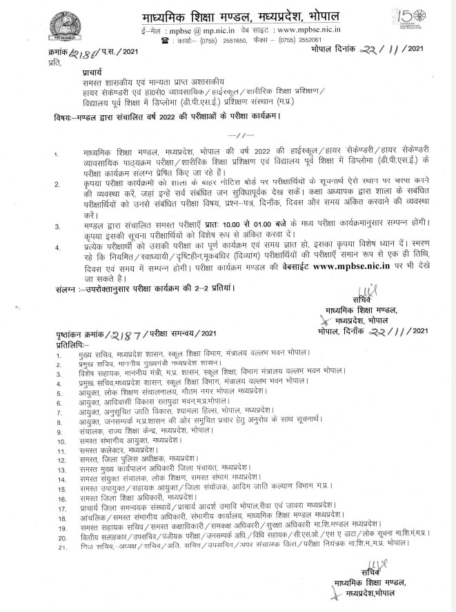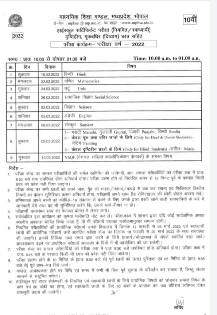 मध्यप्रदेश माध्यमिक शिक्षा मंडल द्वारा कक्षा 10वी एवं 12वीं कक्षा की बोर्ड परीक्षा का कार्यक्रम घोषित किया गया है।कक्षा 10वीं की वार्षिक परीक्षा 18 फरवरी एवं कक्षा 12वीं की वार्षिक परीक्षा 17 फरवरी 2022 से आयोजित की जाएगी।