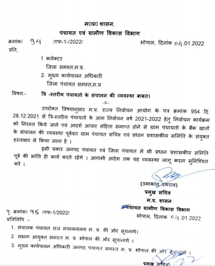 मध्य प्रदेश में पंचायत चुनाव को निरस्त कर दिया गया है , लेकिन पंचायतों के संचालन के लिए पंचायत एवं ग्रामीण विकास विभाग ने आदेश जारी किया है .