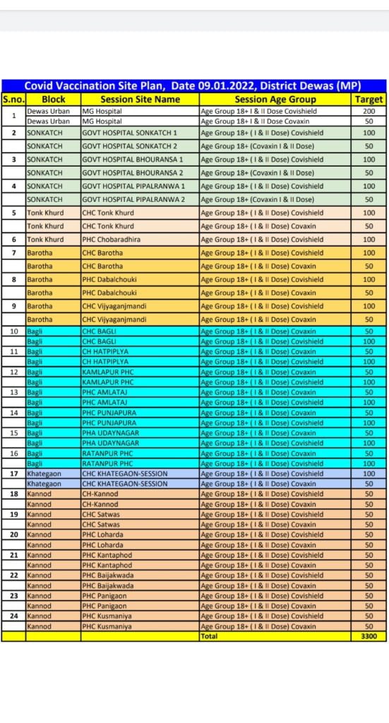 18 वर्ष से अधिक उम्र के व्यक्तियो को दिनांक 09 जनवरी 2022 को देवास जिले के ग्रामीण एवं शहरी क्षेत्र में 24 टीकाकरण केंद्रों पर वैक्सीन डोज़ लगाई जायेगी । कोविड-19 टीकाकरण की जानकारी के लिये स्वास्थ्य कार्यकर्ता, आशा कार्यकर्ता, आगनवाडी कार्यकर्ता से सम्पर्क कर सकते है। वैक्सीनेशन संबंधी जानकारी के लिए कोविड कमाण्ड एण्ड कन्ट्रोल सेन्ट्रल स्थापित किया गया है जिसका नम्बर 07272-222202 पर सम्पर्क कर सकते है।
