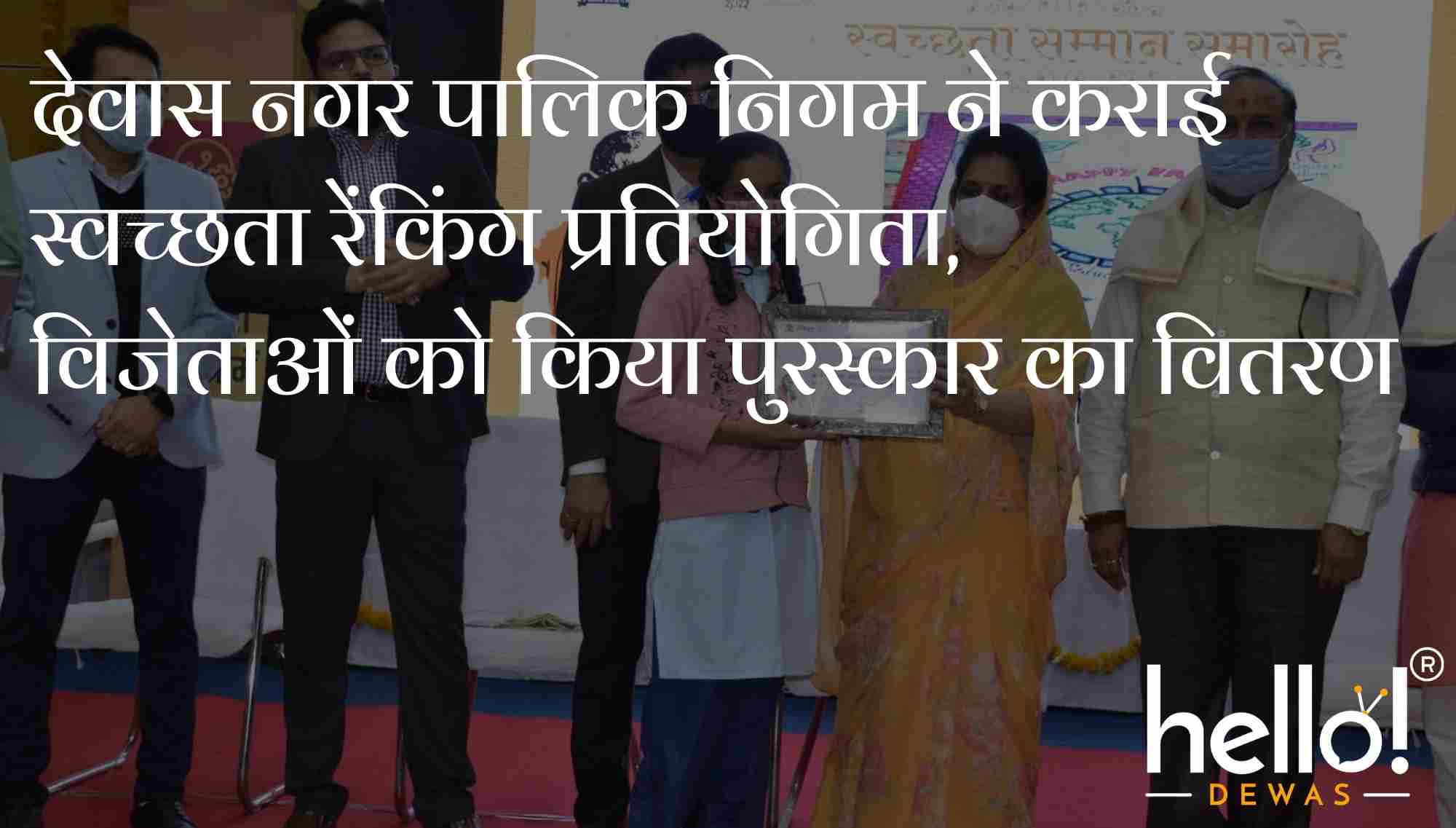 देवास। स्वच्छता के क्षेत्र में नगर पालिक निगम के प्रयास निरंतर जारी हैं। इस दिशा में आम जनों के सहयोग को देखते हुए प्रतिवर्ष के अनुसार इस वर्ष भी स्वच्छता रैंकिंग प्रतियोगिता आयोजित की गई। जिसमें सभी विजेता प्रतिभागियों को आयोजित स्वच्छता रेंकिंग सम्मान समारोह का आयोजन मल्हार स्मृति आडिटोरियम में कर विशिष्ट योगदान देने वाली संस्थाओं को सम्मानित किया गया। कार्यक्रम का प्रारंभ महात्मा गांधी के चित्र के समक्ष दीप प्रज्वलन कर हुआ। मुख्य अतिथि देवास विधायक श्रीमंत गायत्री राजे पवार ने विजेताओं को बधाई दी। पूर्व महापौर सुभाष शर्मा, पूर्व विकास प्राधिकरण उपाध्यक्ष दुर्गेश अग्रवाल, कलेक्टर चंद्रमौली शुक्ला, पुलिस अधीक्षक डॉक्टर शिव दयाल सिंह, जिला पंचायत सी ई ओ प्रकाश सिंह अतिथि के रुप में उपस्थित रहे।