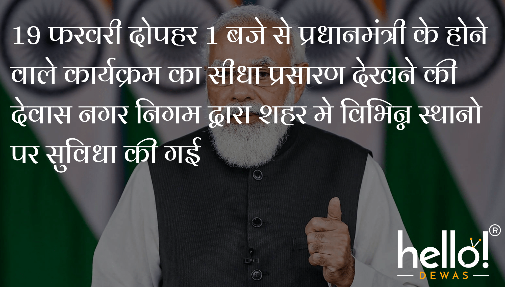 जिसका सीधा प्रसारण नगर निगम द्वारा देवास शहर मे विभिन्न स्थानो के साथ मल्हार स्मृति आडिटोरियम, विक्रम कला भवन जवाहर चौक, निगम परिषद हॉल के साथ अशासकीय स्कुलो पर किया जावेगा। मान. प्रधानमंत्री के उद्बोधन प्रदेश के साथ पूरे देश मे स्वच्छता को आगे ले जाने के लिए प्रेरणादाई होगा उक्त लाईव प्रसारण के श्रवण एवं प्रेरणा लेने के लिए शहर के आम नागरिको के साथ जनप्रतिनिधियो को सीधा प्रसारण देखने की सुविधा नगर निगम द्वारा सतपुडा स्कुल आवास नगर, विजय ज्योति हा.से. स्कुल अर्जुन नगर रधागंज, एमजीएम स्कुल प्रताप नगर, केम्ब्रिज स्कुल त्रिलोक नगर,जेम्स ऐकेडमी ईटावा,ज्ञानसागर स्कुल मुखर्जी नगर, एवनेजर स्कुल उपाध्याय नगर, अनामय पब्लिक स्कुल बावडिया, आक्सफोर्ड स्कुल गंगा नगर, सरस्वती ज्ञानपीठ लक्ष्मण नगर, दर्जी धर्मशाला मोती बंगला, सरस्वती स्कुल भौंसले कालोनी, सेन्टथामस स्कुल बालगढ इन सभी स्कुलो एवं स्थानो पर की गई है।