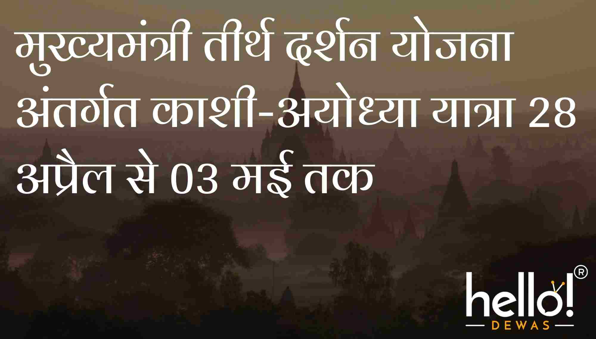 राज्य शासन के निर्देशानुसार मुख्यमंत्री तीर्थ दर्शन योजना अंतर्गत काशी-अयोध्या यात्रा 28 अप्रैल से 03 मई तक होगी।यात्रा में देवास जिले को 200 बर्थ आवंटित किये गए है। यात्रा के लिए आवेदक 22 अप्रैल तक आवेदन कर सकते है। अधिक जानकारी के लिए आवेदक कलेक्टर कार्यालय में संबंधित शाखा में सम्पर्क कर सकते हैं। काशी-अयोध्या यात्रा में इंदौर-देवास-उज्जैन जिले के यात्री शामिल होंगे।