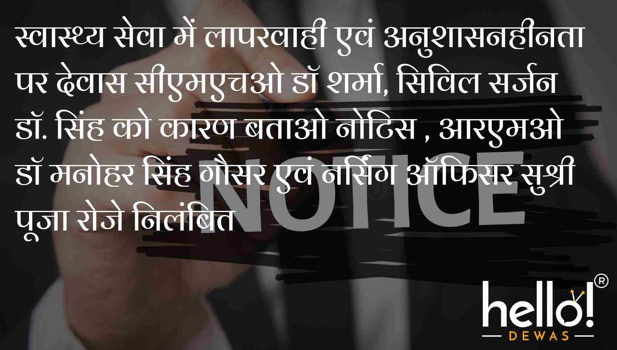 स्वास्थ्य सेवा में लापरवाही एवं अनुशासनहीनता पर देवास सीएमएचओ डॉ शर्मा, सिविल सर्जन डॉ. सिंह को कारण बताओ नोटिस , आरएमओ डॉ मनोहर सिंह गौसर एवं नर्सिंग ऑफिसर सुश्री पूजा रोजे निलंबित
