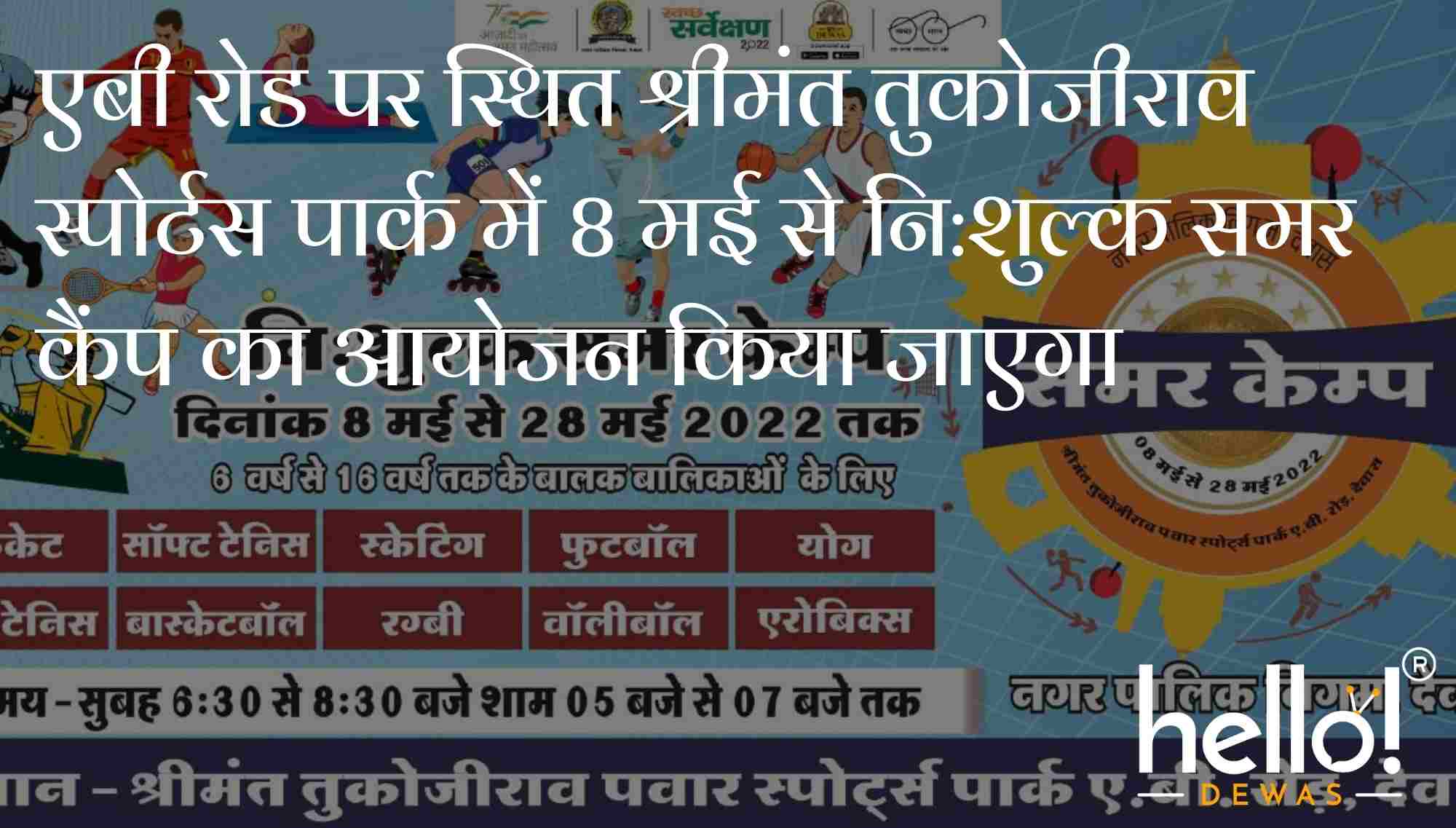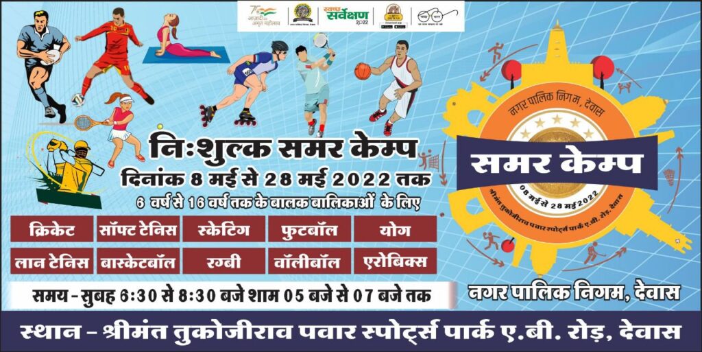 देवास। एबी रोड पर स्थित श्रीमंत तुकोजीराव स्पोर्टस पार्क में खिलाड़ियों की प्रतिभा निखारने के उद्देश्य से नि:शुल्क समर कैंप का आयोजन 8 मई से किया जाएगा। समर कैंप में भाग लेने के लिए नगर निगम की वेबसाइट डीएमसी देवास डॉट कॉम पर रजिस्ट्रेशन की प्रक्रिया शुरू हो चुकी है। रजिस्ट्रेशन की अंतिम तारीख 7 मई है।