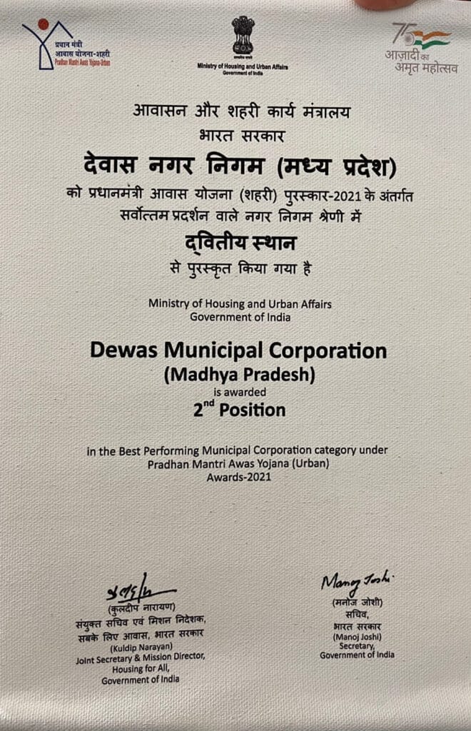 म्युनिसिपल अवार्ड (सिटी लेबल) में बेस्ट परफार्मिंग म्युनिसिपल अवार्ड नगरपालिक निगम देवास को द्वितीय स्थान, बेस्ट परफार्मिंग म्युनिसिपल कॉउंसिल में नगरपालिका परिषद गोहद जिला भिण्ड को द्वितीय और बेस्ट परफार्मिंग नगर पंचायत में नगर परिषद जोबट जिला अलीराजपुर को प्रथम स्थान मिला है। बेस्ट सीएलटीसी अवार्ड नगरपालिक निगम देवास, नगरपालिका परिषद गोहद और नगर परिषद जोबट को मिला है।प्रधानमंत्री श्री नरेन्द्र मोदी ने बुधवार को राजकोट (गुजरात) में इंडियन अर्बन हाउसिंग कॉनक्लेव में नगरीय विकास एवं आवास मंत्री श्री भूपेन्द्र सिंह को बेस्ट परफार्मिंग स्टेट का अवार्ड प्रदान किया। इस दौरान केन्द्रीय आवासन एवं शहरी कार्य मंत्री श्री हरदीप सिंह पुरी, म.प्र. के प्रमुख सचिव नगरीय विकास एवं आवास श्री मनीष सिंह, आयुक्त नगरीय प्रशासन एवं विकास श्री भरत यादव और स्टेट मिशन डायरेक्टर श्री सतेन्द्र सिंह भी उपस्थित थे।