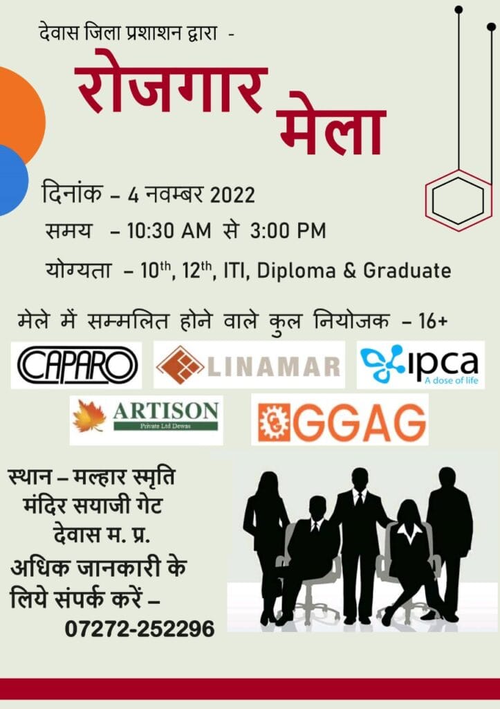 इसी क्रम में मल्‍हार स्‍मृति मंदिर देवास में जिलास्‍तरीय रोजगार मेले का आयोजन 04 नवंबर को सुबह 10.30 बजे से दोपहर 03 बजे तक होगा। कलेक्‍टर श्री चन्‍द्रमौली शुक्‍ला ने जिला स्‍तरीय #रोजगार_मेले के सफल आयोजन के लिए अधिकारियों को दायित्‍व भी सौंपे है। रोजगार मेले में लगभग एक हजार युवाओं को नोकरी देने का लक्ष्‍य रखा गया है। मेले में देवास और इन्‍दौर की निजी कम्‍पनियों द्वारा भाग लिया जायेगा।इच्‍छुक आवेदक रोजगार मेले में अपने शैक्षणिक प्रमाण-पत्रों के साथ उपस्थित हो सकते है।