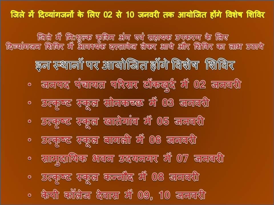 देवास जिले में दिव्‍यांगजनों को नि:शुल्‍क कृत्रिम अंग एवं सहायक उपकरण प्रदान करने के लिए एडीआईपी योजनान्‍तर्गत विशेष परीक्षण/चिन्‍हांकन शिविरों का आयोजन किया जायेगा। जिले में विशेष शिविर जनपद पंचायत परिसर टोंकखुर्द में 02 जनवरी, उत्‍कृष्‍ट स्‍कूल सोनकच्‍छ में 03 जनवरी, उत्‍कृष्‍ट स्‍कूल खातेगांव में 05 जनवरी, उत्‍कृष्‍ट स्‍कूल बागली में 06 जनवरी, सामुदायिक भवन उदयनगर में 07 जनवरी, उत्‍कृष्‍ट स्‍कूल कन्‍नौद में 08 जनवरी तथा केपी कॉलेज देवास में 09, 10 जनवरी को आयोजित होंगे। कलेक्‍टर श्री गुप्‍ता ने सभी संबंधित अधिकारियों को शिविर के संबंध में आवश्‍यक तैयारियां के निर्देश दिये है।