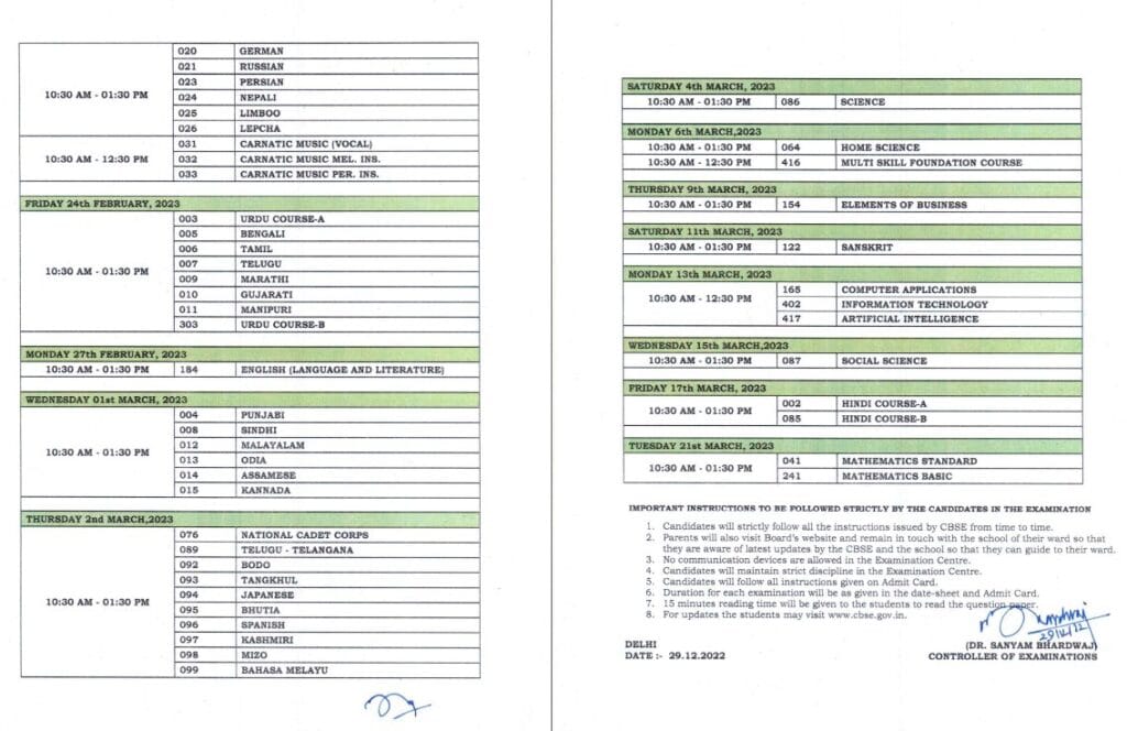 सीबीएसई 10वीं की बोर्ड परीक्षा पेंटिंग, राय, गुरुंग, तमांग, शेरपा और थाई पेपर के साथ शुरू होगी और गणित के मानक और गणित के बेसिक पेपर के साथ समाप्त होगी. अधिकांश पेपरों की परीक्षा का समय सुबह 10:30 बजे से दोपहर 1:30 बजे तक होगा. सीबीएसई 12वीं बोर्ड परीक्षा एंटरप्रेन्योरशिप के पेपर से शुरू होगी और साइकोलॉजी के पेपर के साथ खत्म होगी. कक्षा 12 की परीक्षाओं का समय अधिकांश पेपरों के लिए सुबह 10:30 बजे से दोपहर 1:30 बजे तक होगा.
