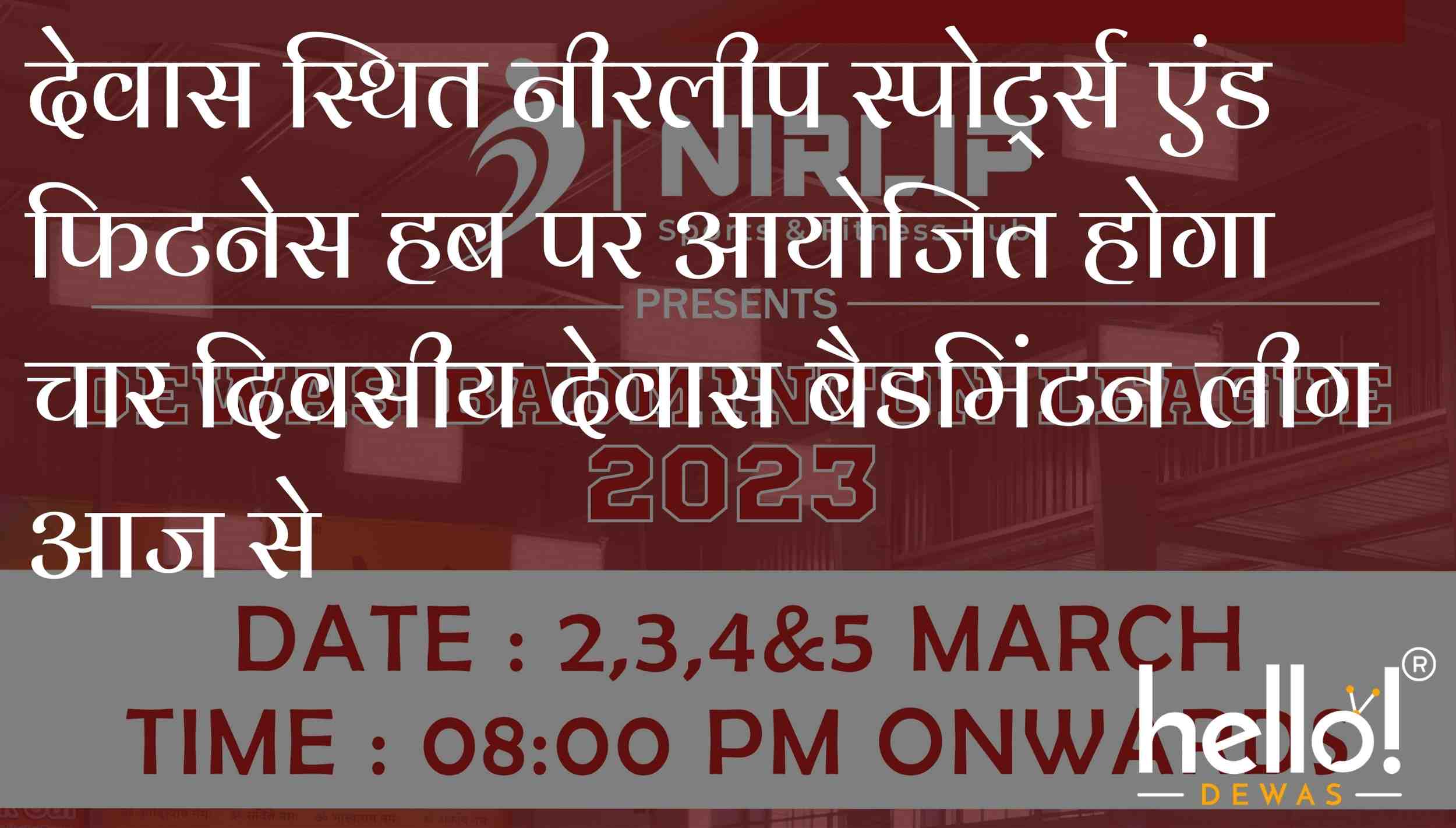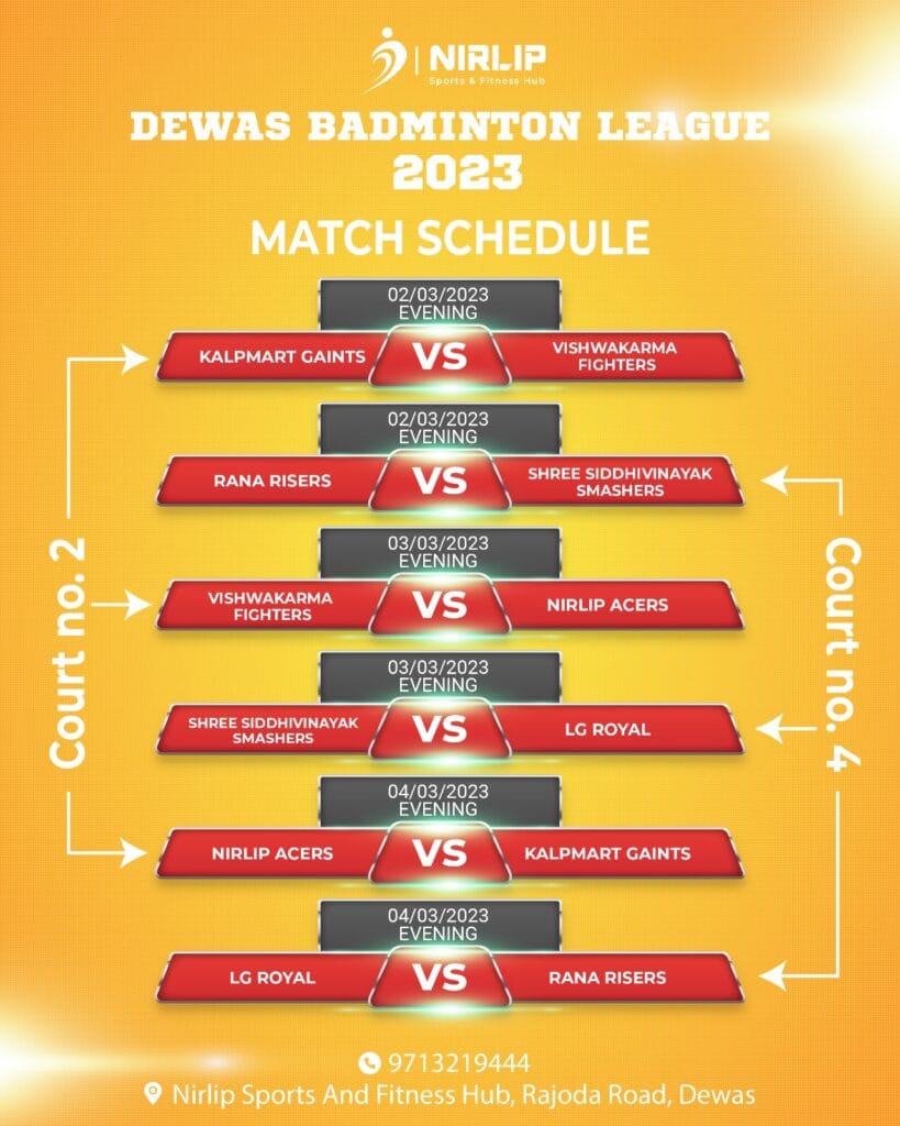 देवास। चार दिवसीय देवास बैडमिंटन लीग का शुभारंभ आज दिनांक 02/03/2023 गुरुवार शाम 8 बजे, राजोदा रोड स्थित नीरलीप स्पोर्ट्स एंड फिटनेस हब पर होगा। इस लीग में 6 फ्रेंचाइजी है एल जी रॉयल, विश्वकर्मा फाइटर्स, कल्पमार्ट जायंट्स, राणा राईजर्स, श्री सिद्धिविनायक स्मैशर्स और नीरलीप एसर्स । आज 2 टाई में कुल 14 मैच खेले जाएंगे। प्रथम टाई कल्पमार्ट जायंट्स vs विश्वकर्मा फाइटर्स और दूसरी टाई राणा राइजर्स vs श्री सिद्धिविनायक स्मैशर्स के बीच खेली जाएंगी । नीरलीप स्पोर्ट्स एंड फिटनेस हब इस तरह के एक अद्वितीय खेल आयोजन अवधारणा के लिए देवास में अग्रणी समूह हैं।